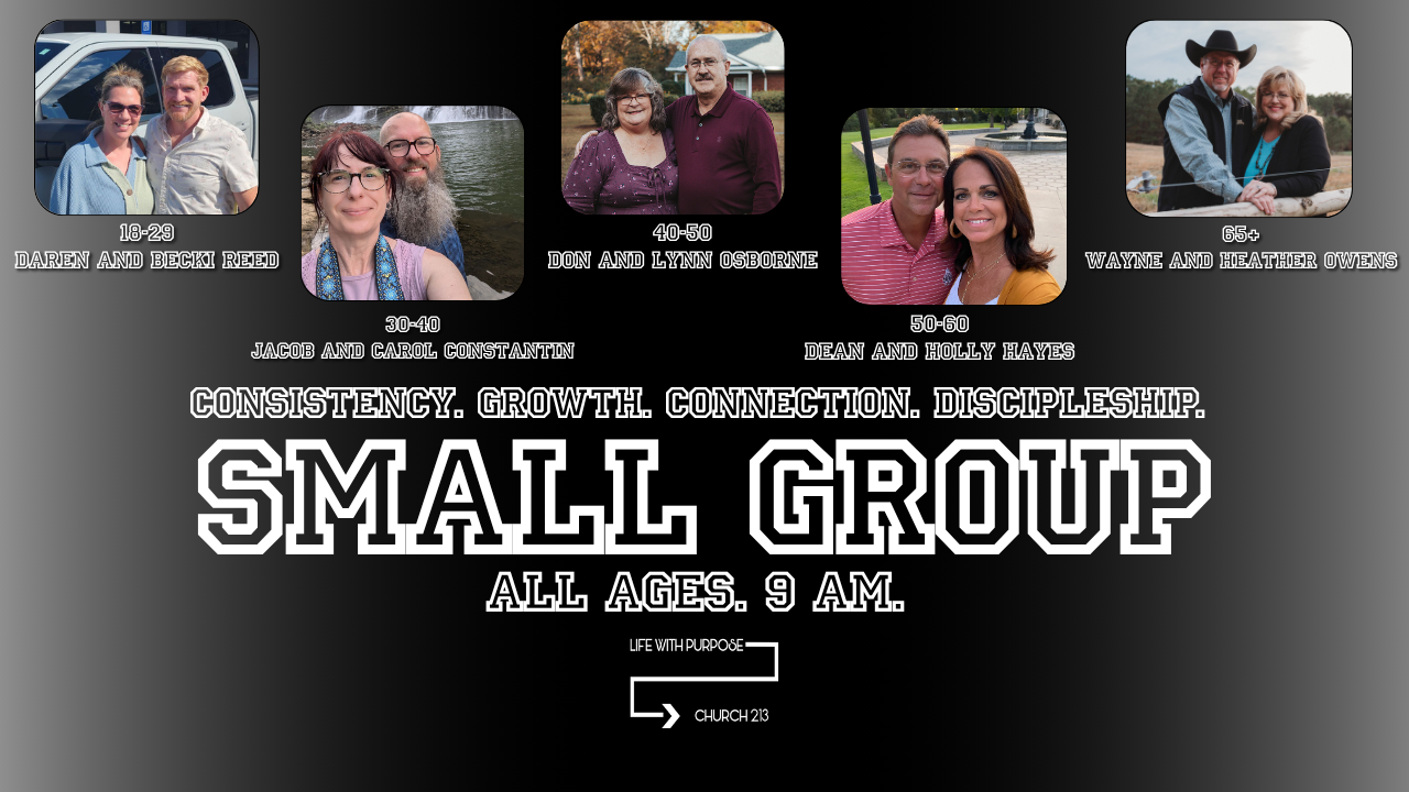 As we move into 2025, we’re revamping our Small Group model. Small Group is moving back to Sunday mornings at 9am. We’re splitting our groups into age groups ranging from 18-65+. These groups will stay consistent throughout the year, only with a changing curriculum. We wanted to move back to a model like this because if we want to do life together, we need to do life together for longer and more frequently outside of church hours!